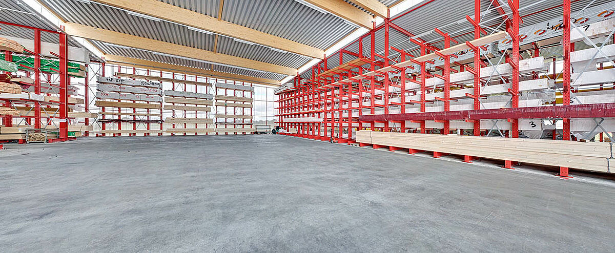 As estantes de dupla face Cantilever atingem 8.600 milímetros no ponto mais alto e oferecem 6 níveis de armazenamento em cada lado. Com uma capacidade de carga de 800 kg por Cantilever, se pode armazenar dessa maneira, por exemplo, uma série de estantes com 33 prateleiras, com um peso total de 26,4 toneladas de material por superfície. A área de carga total para o armazenamento de madeira é de aprox. 3.100 m2. A altura é de 9.750 milímetros. Aqui devemos considerar que para a construção do telhado foi selecionada uma combinação de encapado com cola e aço pelo cliente. A extensão é de aprox. 21.000 milímetros. O cliente pôde economizar dinheiro na realização dessa produção.