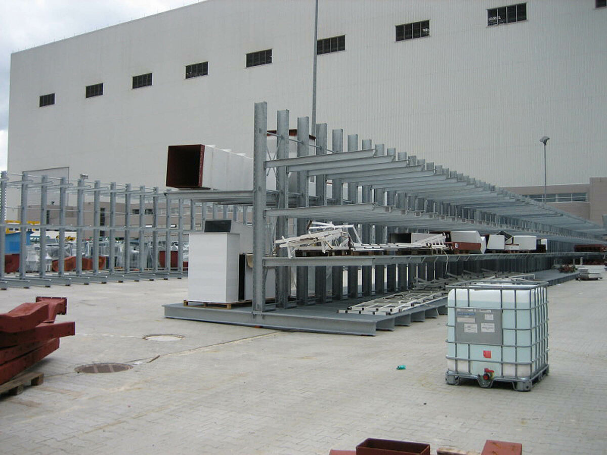 Devido às cargas pesadas e à mediocre capacidade de resistência do chão, uma construção especial foi concebida para distribuir as cargas dos quadros em uma área maior. Para o uso externo, as estantes foram entregues galvanizadas e montadas por instaladores especializados