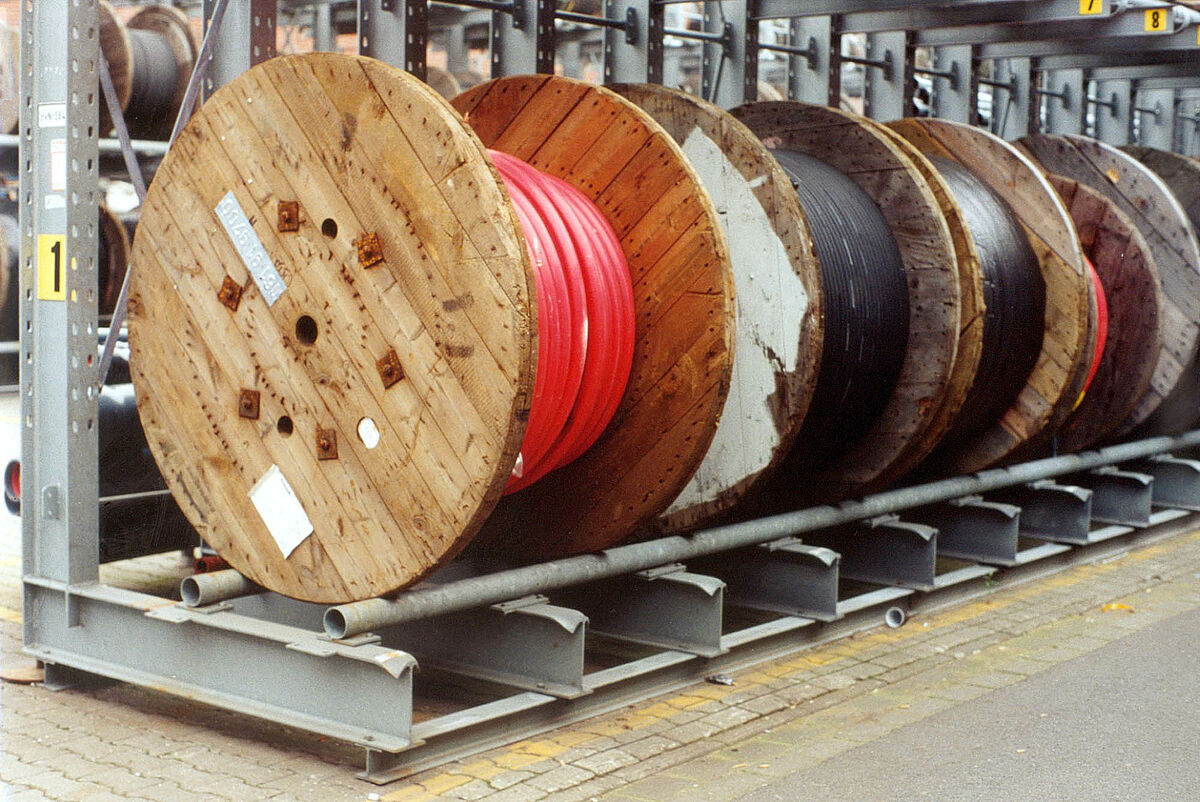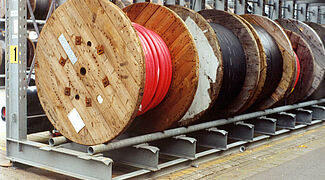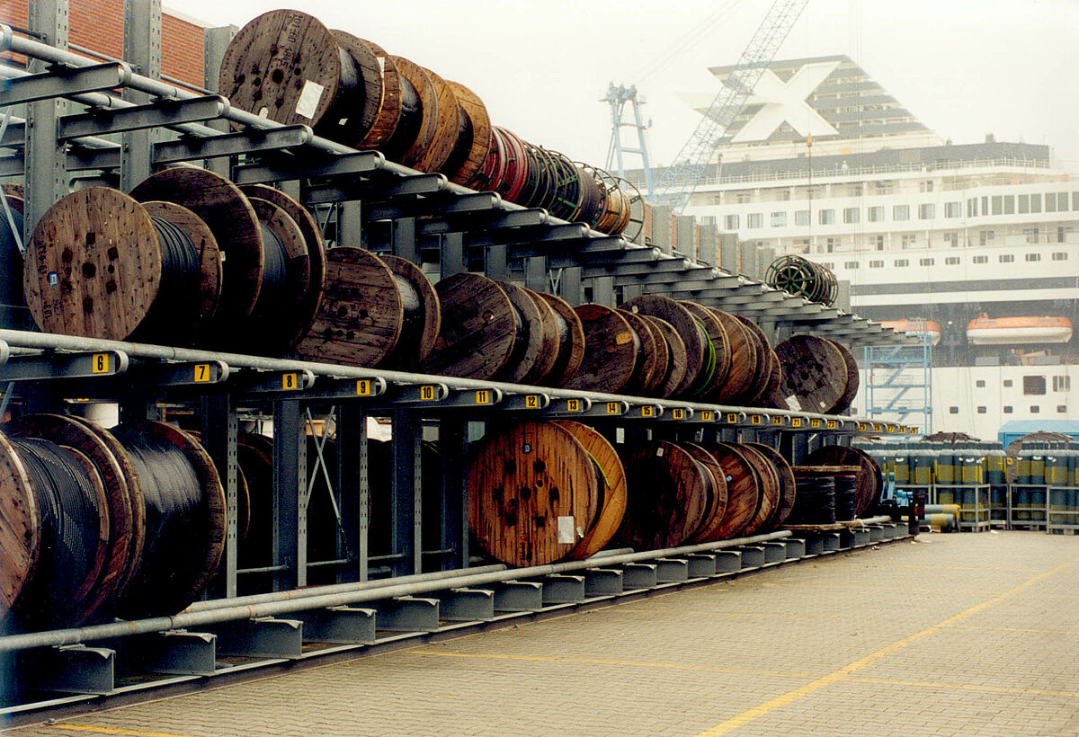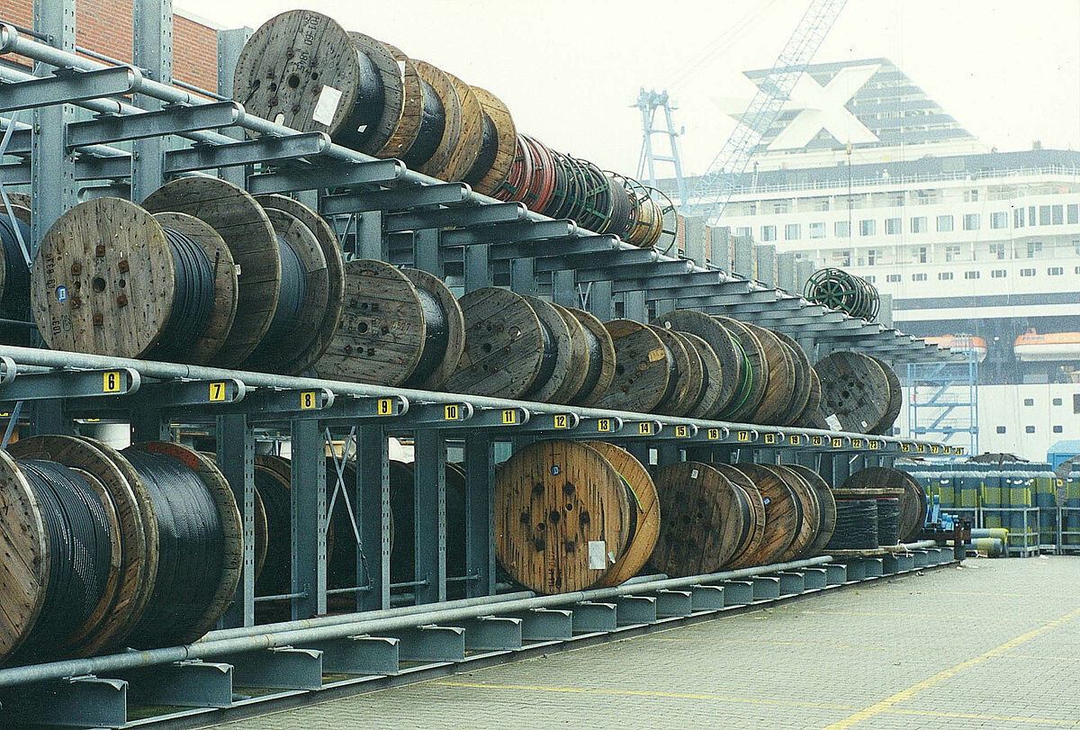 Tambores para enrolamento de cabos com diferentes tamanhos e pesos são armazenados sem qualquer perda de espaço nas firmes estantes Cantilever da OHRA. A altura da estante é de 4.500 mm, com profundidade utilizável de 1.400 mm e 1.200 mm, dependendo do diâmetro do tambor.